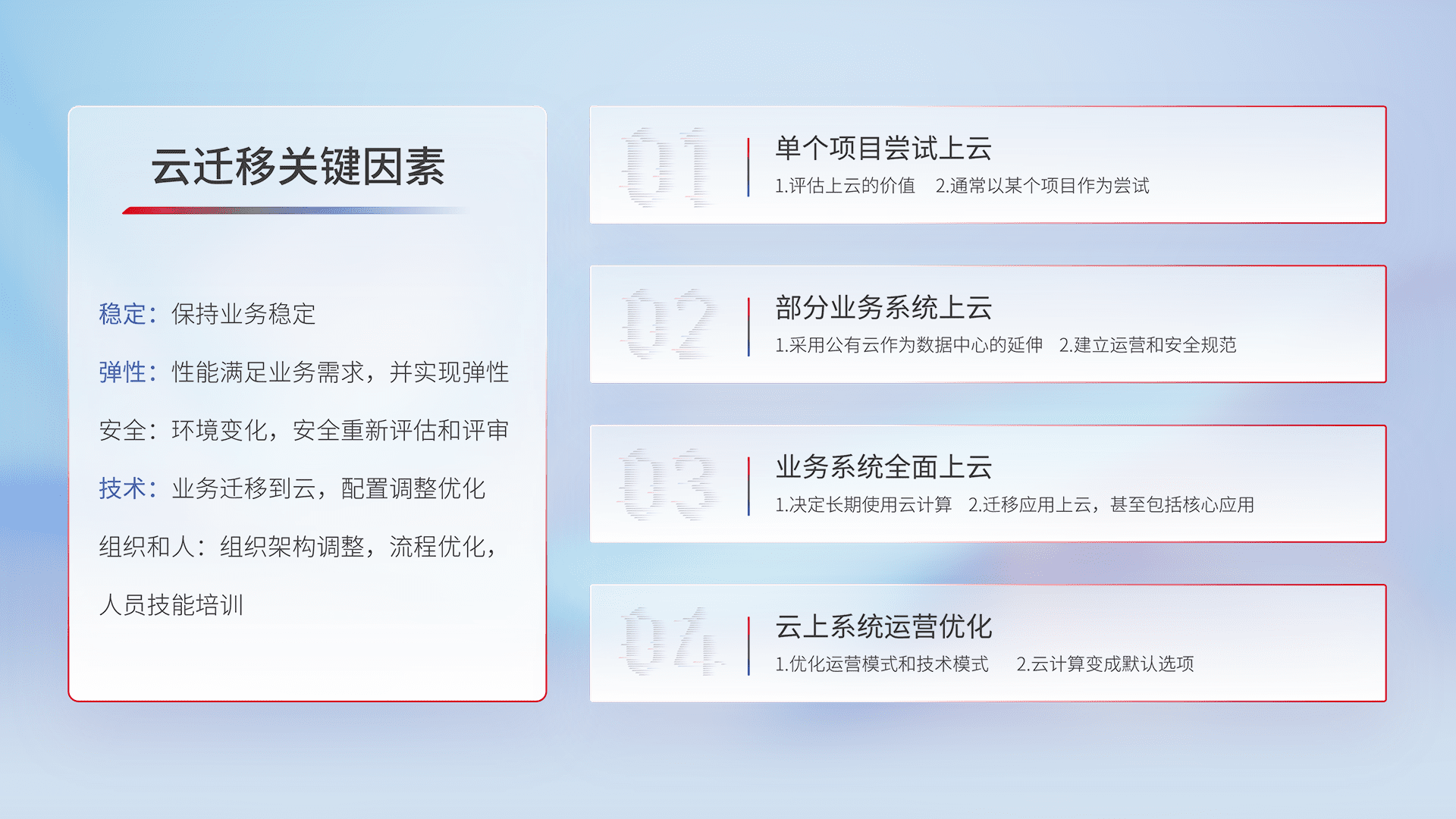 结合实际业务,,从规划设计、、、云平台选型、、、、云原生改造、、、、数据迁移、、集成交付,,,,迁移全过程为客户识别最佳上云路径,,,,做好风险识别管理,,设计网络架构、、、、身份权限、、安全审计合规、、、操作审计、、日志审计、、、、监控告警策略、、、多站点容灾设计等,,,对云上基础设施进行整体规划,,提升IT治理水平,,,以满足弹性、、高可用、、、高性能的需求。。。。